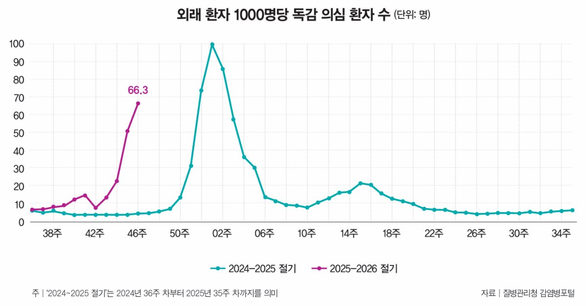 독감이 아동과 청소년을 중심으로 급격히 확산하고 있다. 11월 27일 질병관리청 독감 환자 표본 감시 결과에 따르면 11월 둘째 주(11월 10~16일) 외래 환자 1000명당 독감 의심 환자 수(의사환자 분율)는 66.3명이다(그래프 참조). 이는 직전 주(50.7명)보다 약 30.8% 늘어난 규모로 지난해 같은 기간 의사환자 분율(4.6명)의 14.4배에 이른다. 특히 7~12세 의사환자 분율이 170.4명, 13~18세 의사환자 분율이 112.6명으로 다른 연령대에 비해 높다.고교 2학년생 C 양은 11월에 독감을 2번이나 앓았다. C 양은 “11월 6일에 A형 독감을 진단받고 격리가 풀린 11일 의사 선생님이 ‘또 독감에 걸릴 수 있으니 마스크를 잘 쓰라’고 해 밥 먹을 때 빼고는 계속 착용했는데도 20일에 또 A형 독감을 진단받았다”며 “의사 선생님이 올겨울에는 3번, 4번도 독감에 걸릴 수 있으니 방학 전까지 마스크를 잘 쓰라고 했다”고 말했다. C 양은 “첫 번째 독감 때는 많이 아프지 않았는데 두 번째 때는 너무 아파서 팔을 들지도 못할 정도였다”고 덧붙였다.
