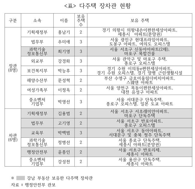 14명의 다주택자는 장관 8명, 차관 6명이다. 홍남기 경제부총리와 추미애(법무부), 최기영(과학기술정보통신부), 강경화(외교부), 박능후(보건복지부), 문성혁(해양수산부), 이정옥(여성가족부), 박영선(중소벤처기업부) 장관이 2주택 이상 보유하고 있으며 김용범(기획재정부), 고기영(법무부), 박백범(교육부), 정병선(과학기술정보통신부), 윤종인(행정안전부), 강성천(중소벤처기업부) 차관이 다주택자다.
