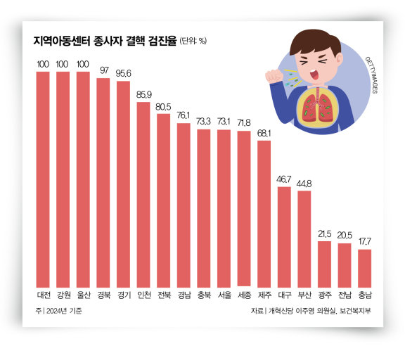 돌봄 시설 종사자는 어린이에 대한 결핵 전염을 막기 위해 법적으로 연 1회 결핵 검진을 받아야 한다. 하지만 지난해 전국 17개 광역 지방자치단체 중 지역아동센터 종사자 전원이 결핵 검진을 받은 곳은 3곳에 불과했고 14곳(82%)은 법적 기준인 ‘100% 검진율’에 미달한 것으로 나타났다.