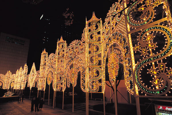가을밤, 서울 한복판에서 빛의 향연이 무르익고 있다. 서울 삼성동 코엑스 중앙광장에서 열리고 있는 ‘2004 루미 페스티벌’. 도시에 어둠이 내리면 수천개의 색 전구가 이루는 찬란한 빛이 ‘천국의 문’ ‘천국의 계단’ ‘두 천사’ …