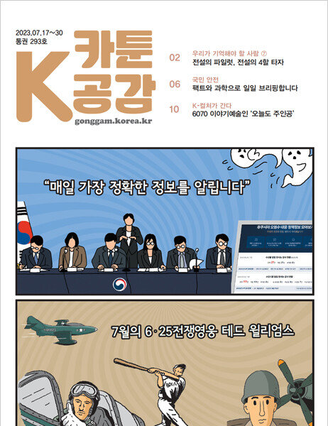 격주간 만화잡지 ‘카툰K-공감’ 293호(2023.7.17.~30.)가 발간됐다. 이번 호에는 국민이 저렴한 보험료로 예기치 못한 풍수해에 대처할 수 있도록 정부가 지원하는 ‘풍수해보험’에 대해 안내한다.또 국가보훈부에서 선정하는 …