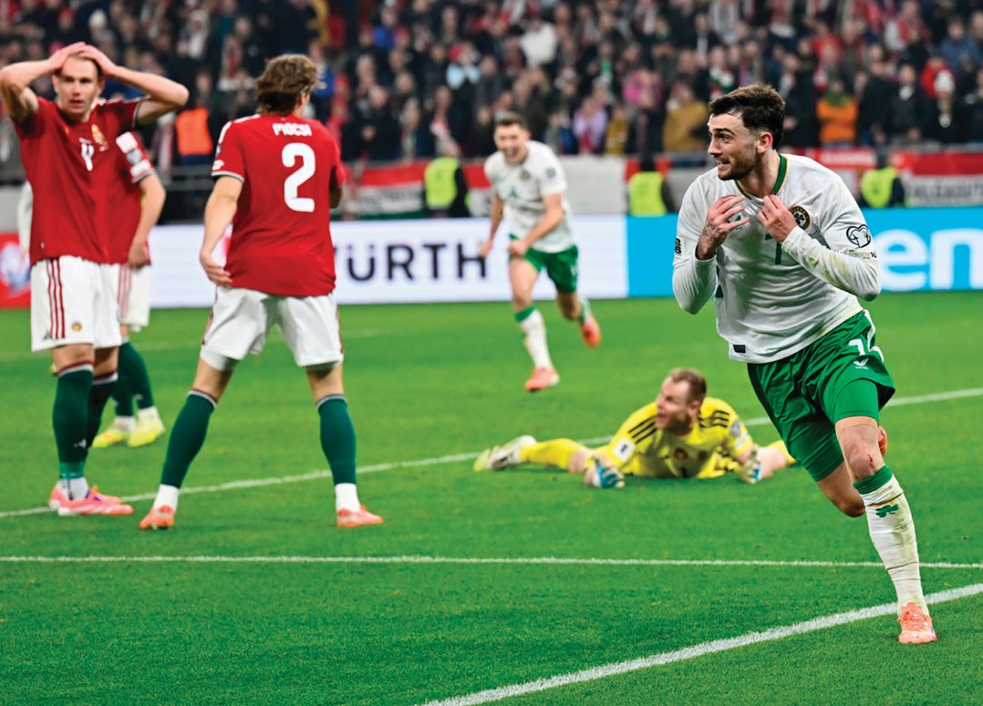 11월 16일(이하 현지 시간) 헝가리 부다페스트에서 열린 헝가리와 아일랜드의 2026 북중미월드컵 F조 예선 경기에서 아일랜드 공격수 트로이 패럿(오른쪽)이 후반 추가 시간에 승부를 결정짓는 골을 넣은 뒤 기뻐하고 있다. 뉴시스
